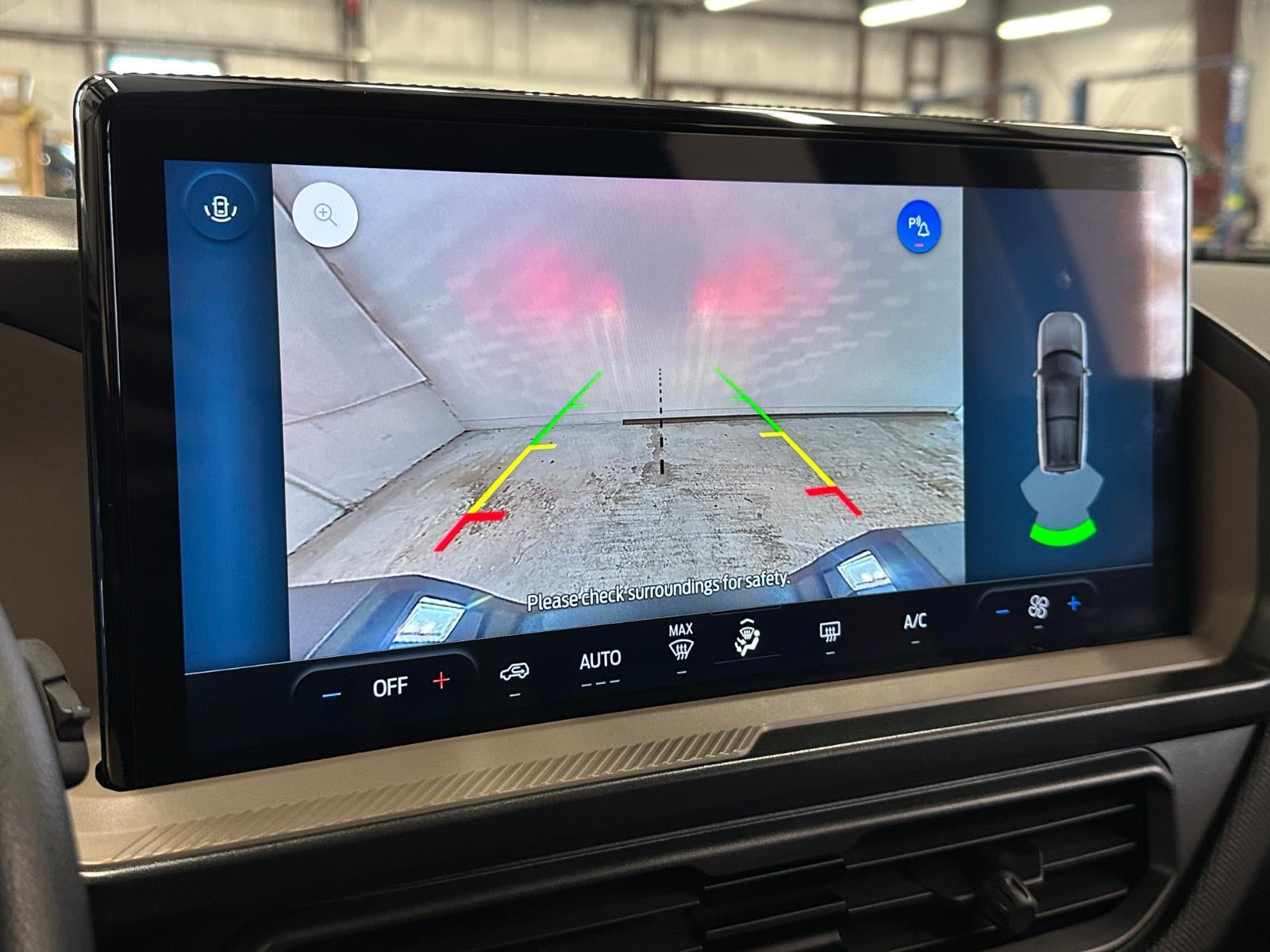 - The vehicle is equipped with a camera that displays an image of the area behind the vehicle on an interior display.